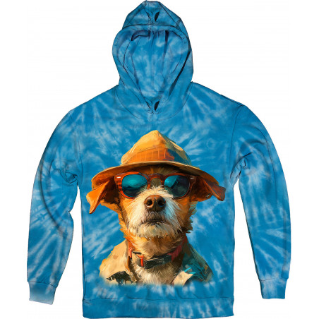 Cozy tie-dye hoodie with a playful black Labrador peeking out design. Realistic details...
