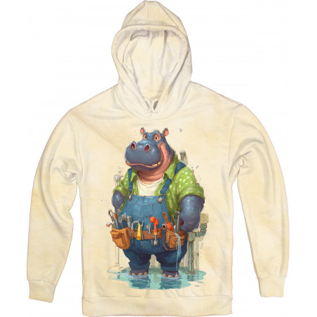 Cozy hoodie with a fun cartoon hippo plumber design. Featuring bright colors, detailed...