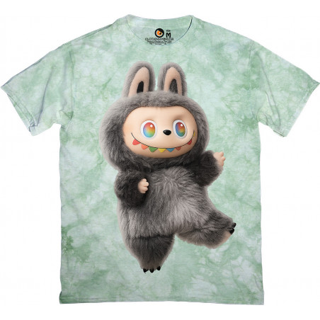 Stylish tie-dye t-shirt featuring the iconic Labubu character in a fluffy bunny suit with...