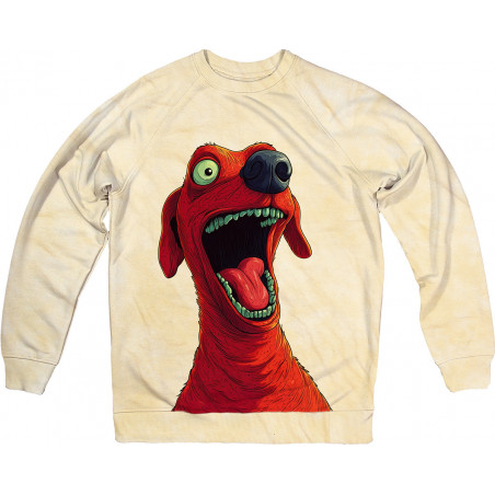 Fun and cozy sweatshirt with a bold cartoon print of a red dog featuring huge eyes and a...
