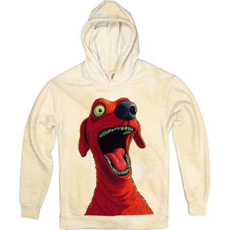Warm and fun hoodie featuring a wild red dog cartoon with big eyes and a goofy wide-open...