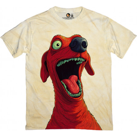 Bold and funny t-shirt featuring a cartoonish red dog with huge eyes and a goofy wide-open...