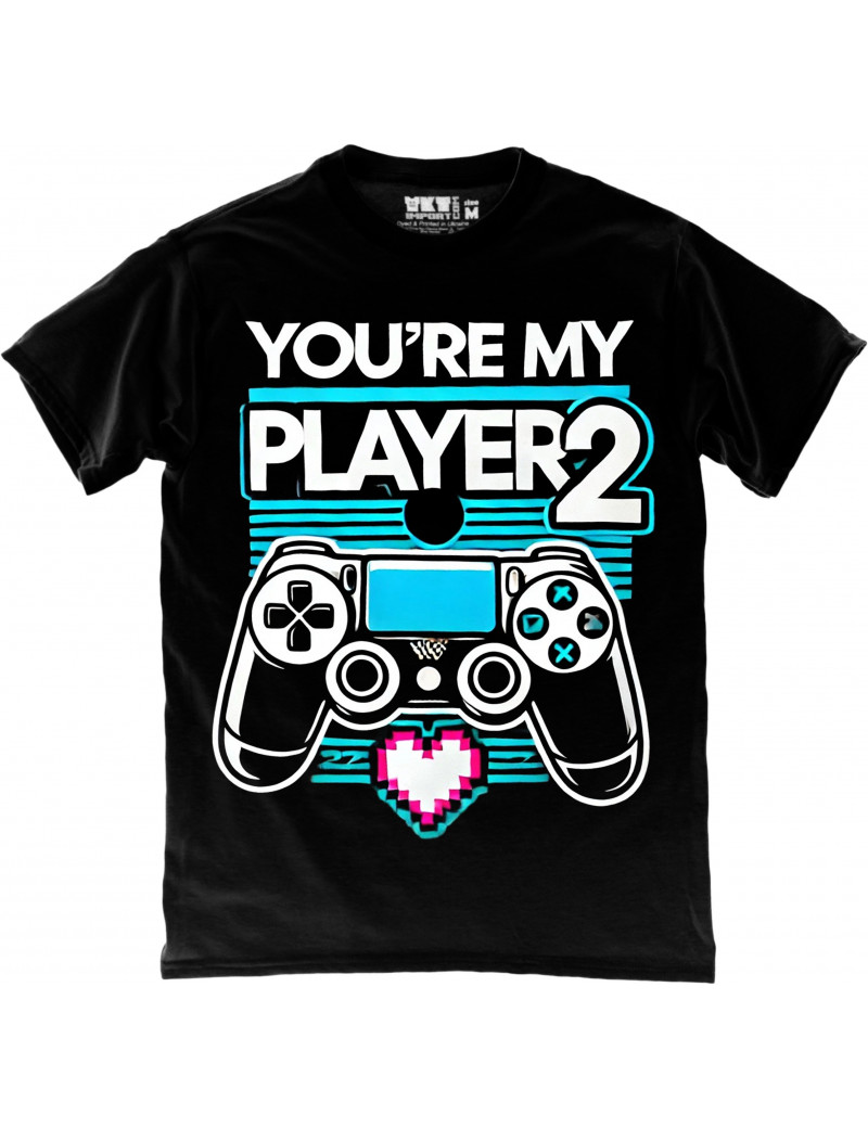 Level up your love game with the Player 2 Valentine’s T-Shirt! Featuring a stylish gaming controller and the heartfelt phrase You’re My Player 2, this tee is perfect for gamers and couples who share a passion for gaming. Crafted on premium black fabric, this design is a fun and unique way to show your love on Valentine’s Day or any day. It’s the ultimate gift for your co-op partner in life! Ready, set, love!