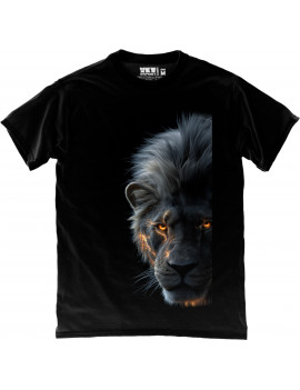 A bold black T-shirt featuring a stunning half-face lion design with fiery glowing eyes. The detailed artwork captures the power, strength, and mystery of the king of the jungle. Perfect for those who want to stand out with confidence and style.