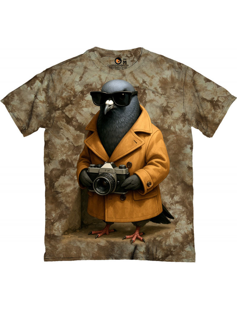 Ever feel like someone’s watching you? It’s probably this pigeon. Rocking a trench coat, vintage camera, and serious secret agent energy, this shirt is perfect for urban explorers, mystery lovers, or anyone who appreciates hilarious high fashion with feathers.