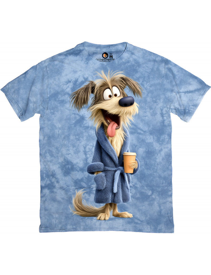A funny cartoon dog in a bathrobe holding coffee — the perfect tee for lazy mornings and good vibes. Soft, comfy, and full of humor!