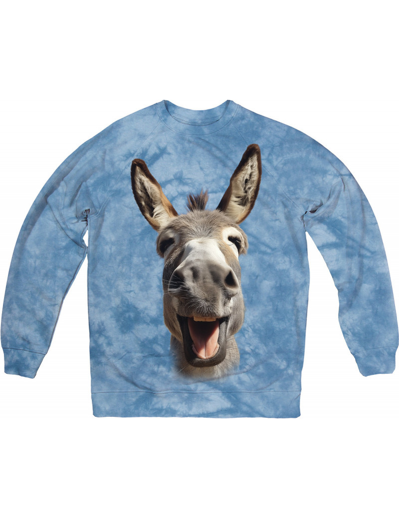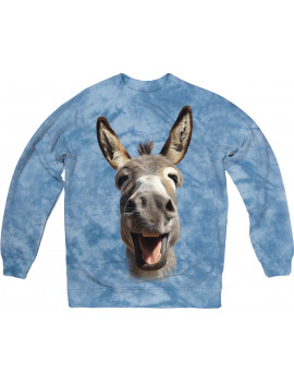 Brighten up your wardrobe (and everyone's day) with this hilarious donkey sweatshirt! Set against a cheerful sky-blue tie-dye background, the ultra-happy donkey brings a burst of joy to your casual style. Cozy, quirky, and made for mood-lifting moments.