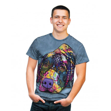 Bright tie-dye t-shirt with a playful black Labrador peeking design. Featuring realistic...
