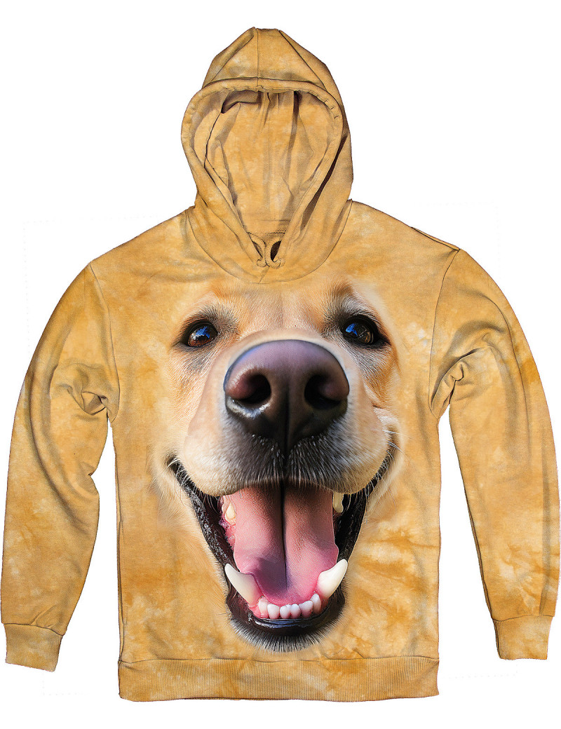 Soft tie-dye sweatshirt with a realistic black Labrador face print. The lifelike details...