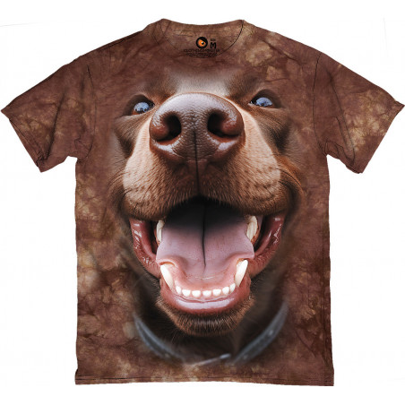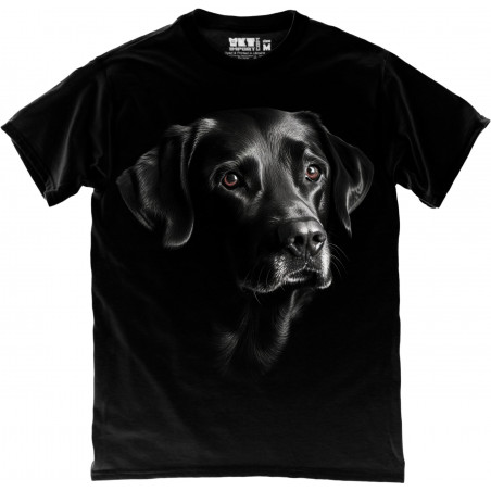 Bright tie-dye t-shirt featuring a realistic print of a black Labrador face with...