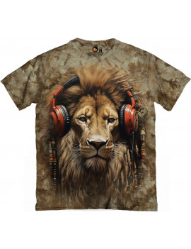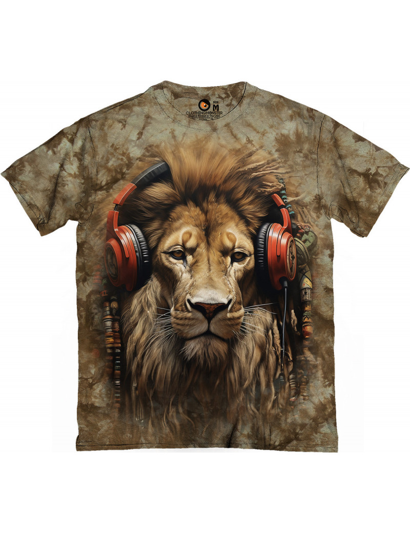 A bold black T-shirt featuring a stunning half-face lion design with fiery glowing eyes....