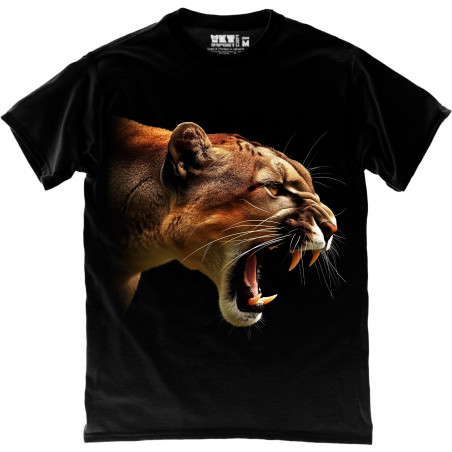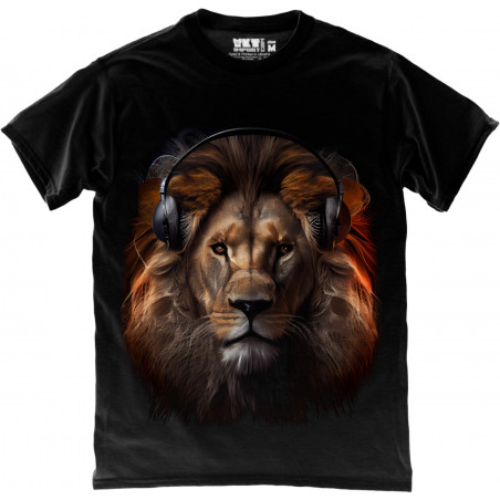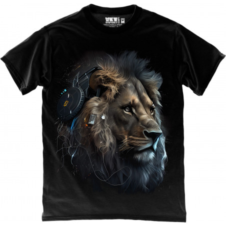 A bold black T-shirt featuring a stunning half-face lion design with fiery glowing eyes....