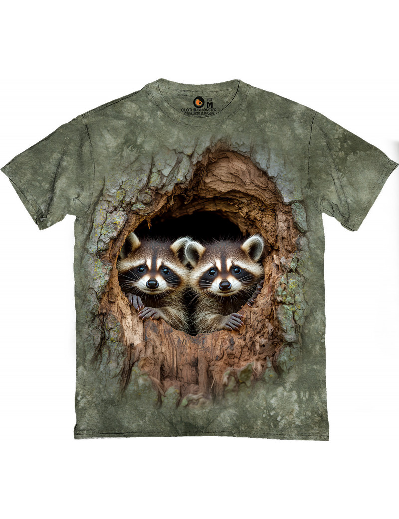 Bring a bit of the wild into your wardrobe with the Curious Raccoon Twins T-shirt. Featuring two adorable baby raccoons peeking out of a tree hollow, this nature-inspired design is perfect for animal lovers.