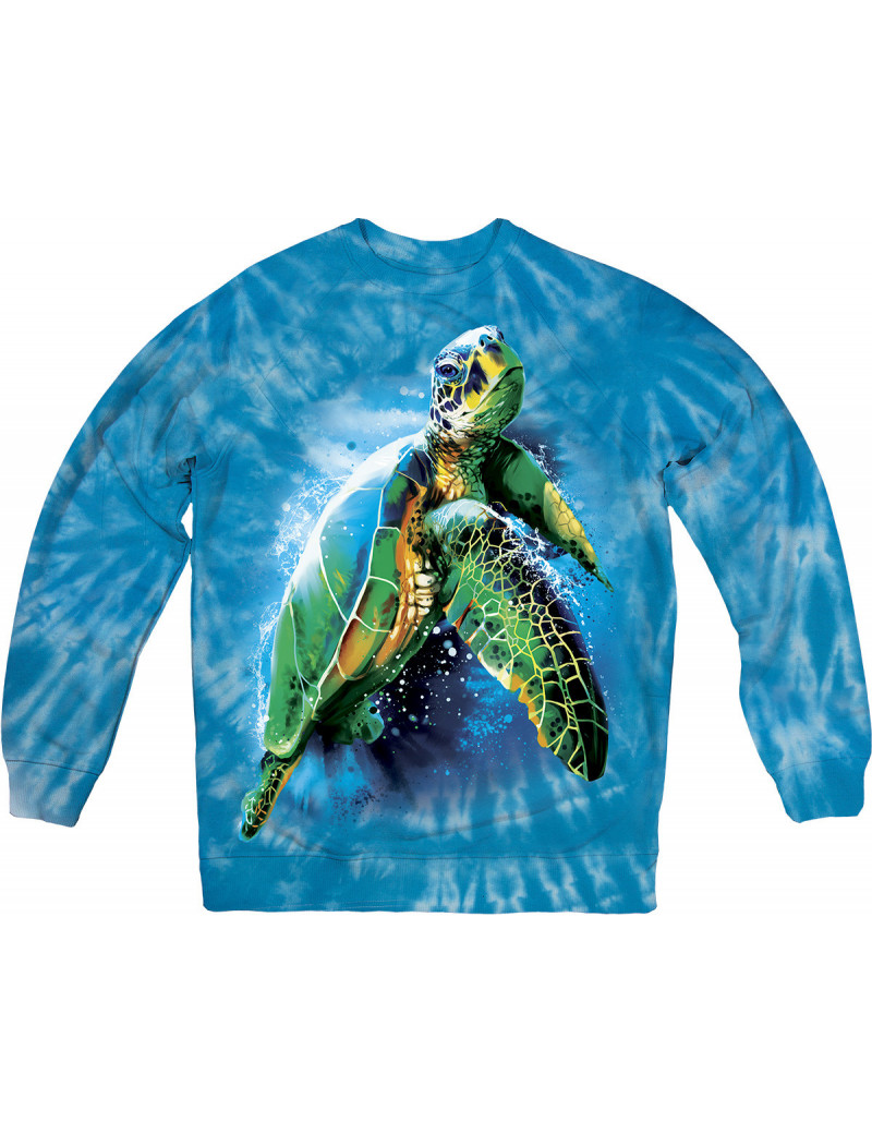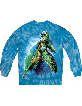 Blue tie-dye T-shirt with a striking graphic of a determined turtle standing on a grenade,...