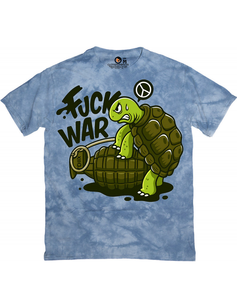 Blue tie-dye T-shirt with a striking graphic of a determined turtle standing on a grenade, paired with a peace symbol. This bold design combines street-style art with a powerful anti-war message, perfect for those who value peace and want to express it in an edgy, eye-catching way.